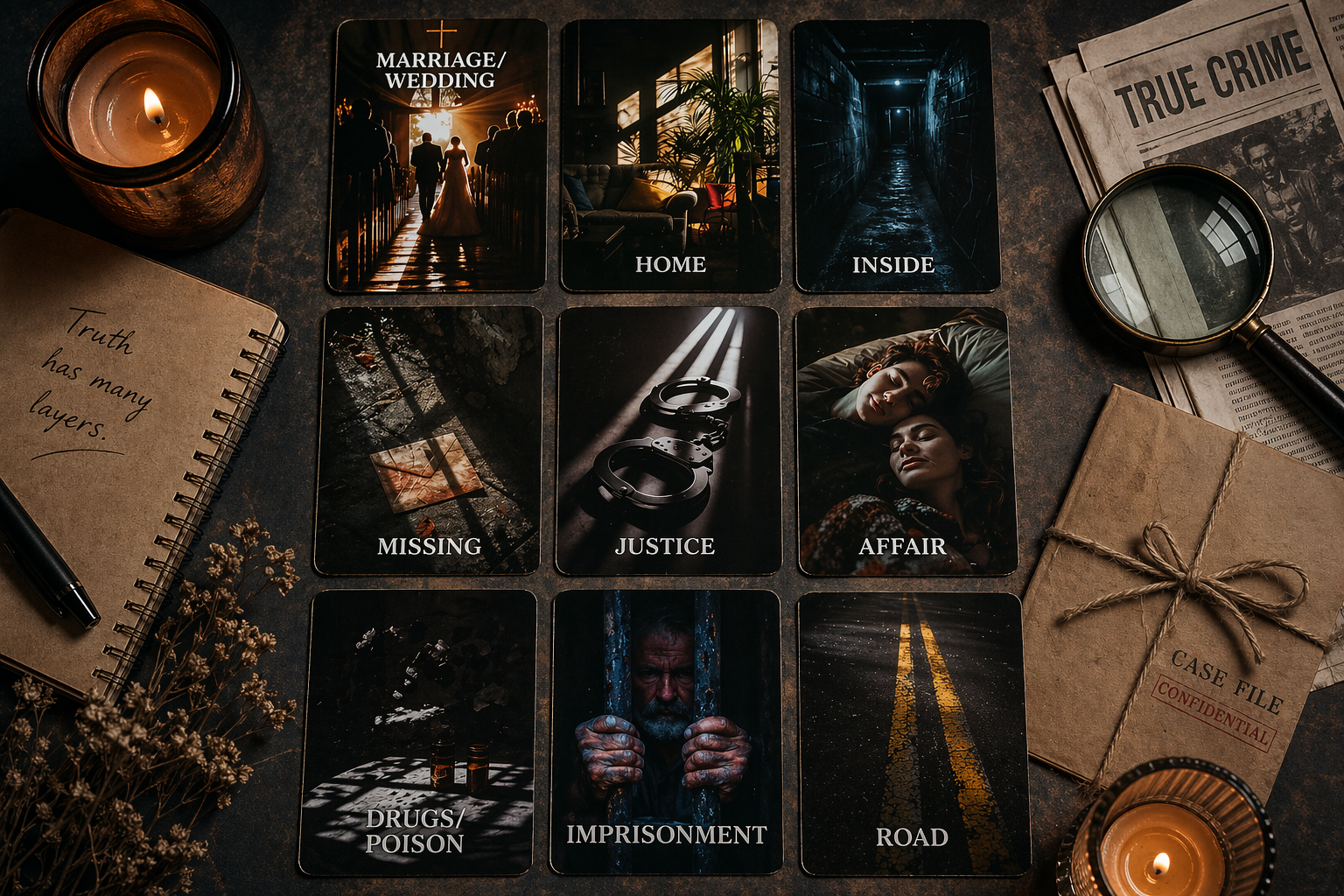 De tweede rij onthult het hart van de zaak. Missing + Justice + Affair vormen een triade die de kern raakt: een zaak met gaten in het bewijs, maar waar het recht toch spreekt. De centrale positie van Justice benadrukt dat recht en verantwoording het thema zijn dat alle andere kaarten omringt.